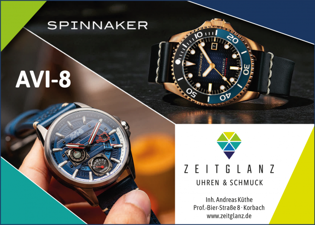 Zeitglanz bringt neue Uhrenmarken nach Korbach Das traditionsreiche Fachgeschäft Zeitglanz in Korbach erfüllt den Wunsch vieler Kunden und erweitert das Sortiment um zwei international erfolgreiche Marken. Ab sofort sind bei Inhaber Andreas Küthe ausgewählte Uhren der Marken Spinnaker und Avi 8 erhältlich, rechtzeitig zum kommenden Weihnachtsgeschäft. Avi 8 – Eine Hommage an die Luftfahrt Die…